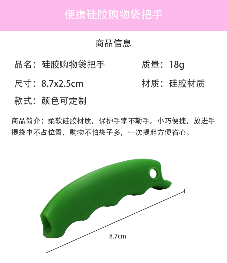 產(chǎn)品名稱 | 硅膠購(gòu)物袋提手 | 質(zhì)量 | 18g |